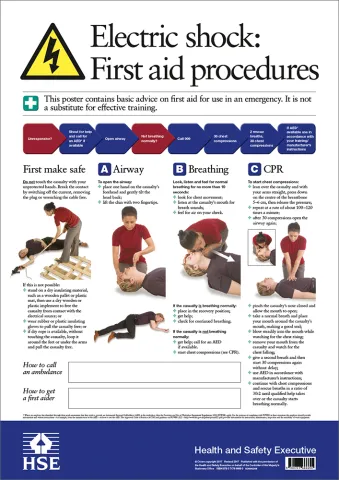 This poster gives basic advice on first-aid procedures if someone has an electric shock at work. It will help employees to understand what to do if an incident should occur. It is aimed at employees working within a number of industries specifically electricity supply, generation, transmission and utilisation, electrical testing and electrical applications.